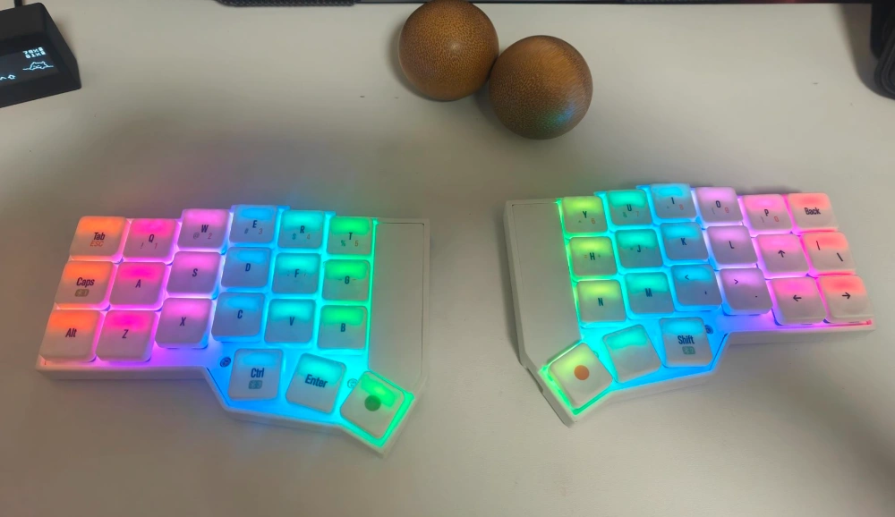 Corne-J Choc ZMK Wireless Keyboard – 42-key split design with hot-swap support for Kailh Choc V1/V2 low-profile switches, per-key RGB lighting, 180mAh battery per side, 10mm-thin case, ZMK firmware, and 5-way navigation. Perfect for coding and productivity.
