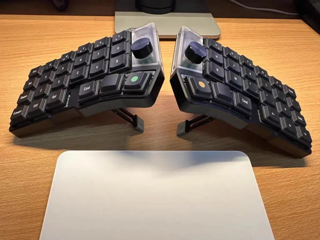 Extended thumb cluster: 3 original Corne curved keys + 3 extra programmable keys per side. Boosts tenting stability, retains muscle memory for 40% keyboard users, eases new ortho users’ learning. Adjustable tenting cuts wrist strain/RSI vs flat keyboards in long typing.